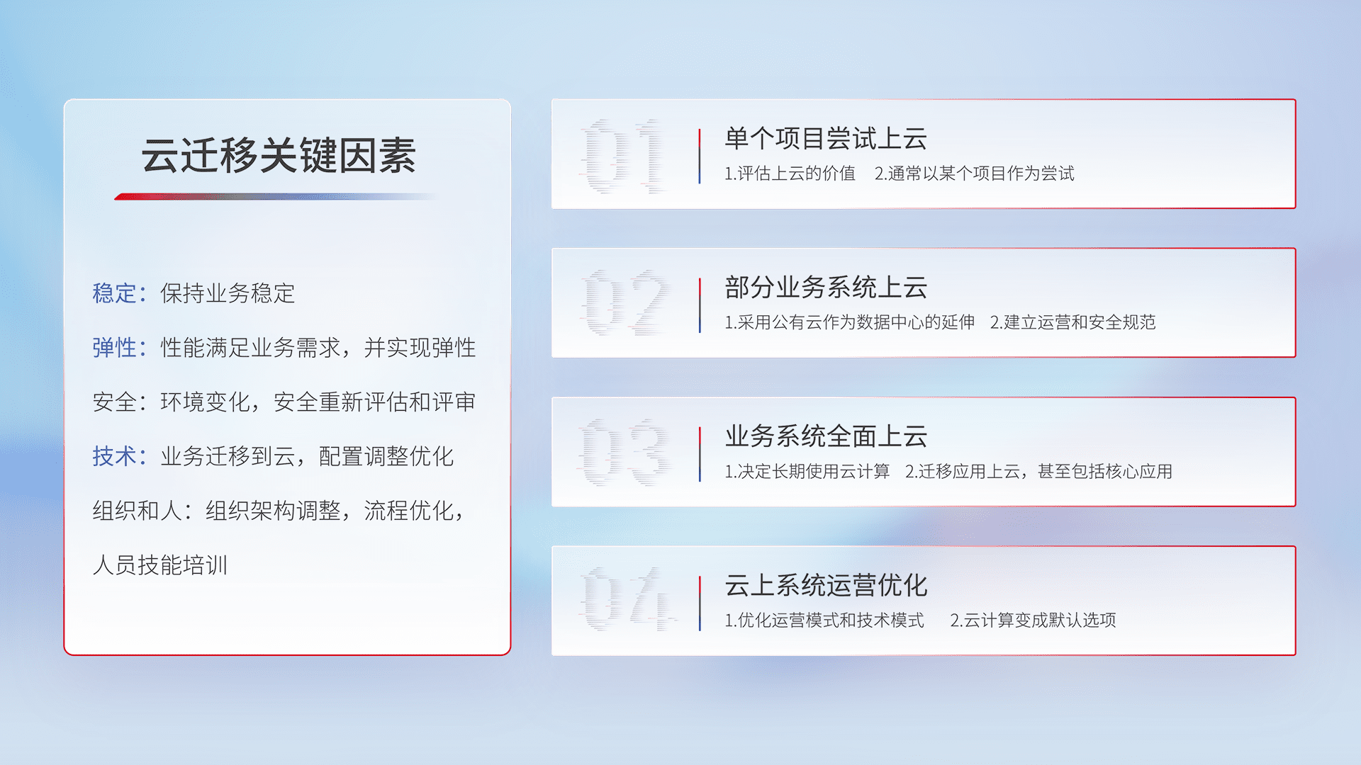 结合实际业务,,,从规划设计、、、、云平台选型、、、、云原生改造、、、、数据迁移、、、集成交付,,迁移全过程为客户识别最佳上云路径,,,做好风险识别管理,,,,设计网络架构、、身份权限、、安全审计合规、、、、操作审计、、、、日志审计、、、、监控告警策略、、、、多站点容灾设计等,,对云上基础设施进行整体规划,,,提升IT治理水平,,,,以满足弹性、、、、高可用、、高性能的需求。。
