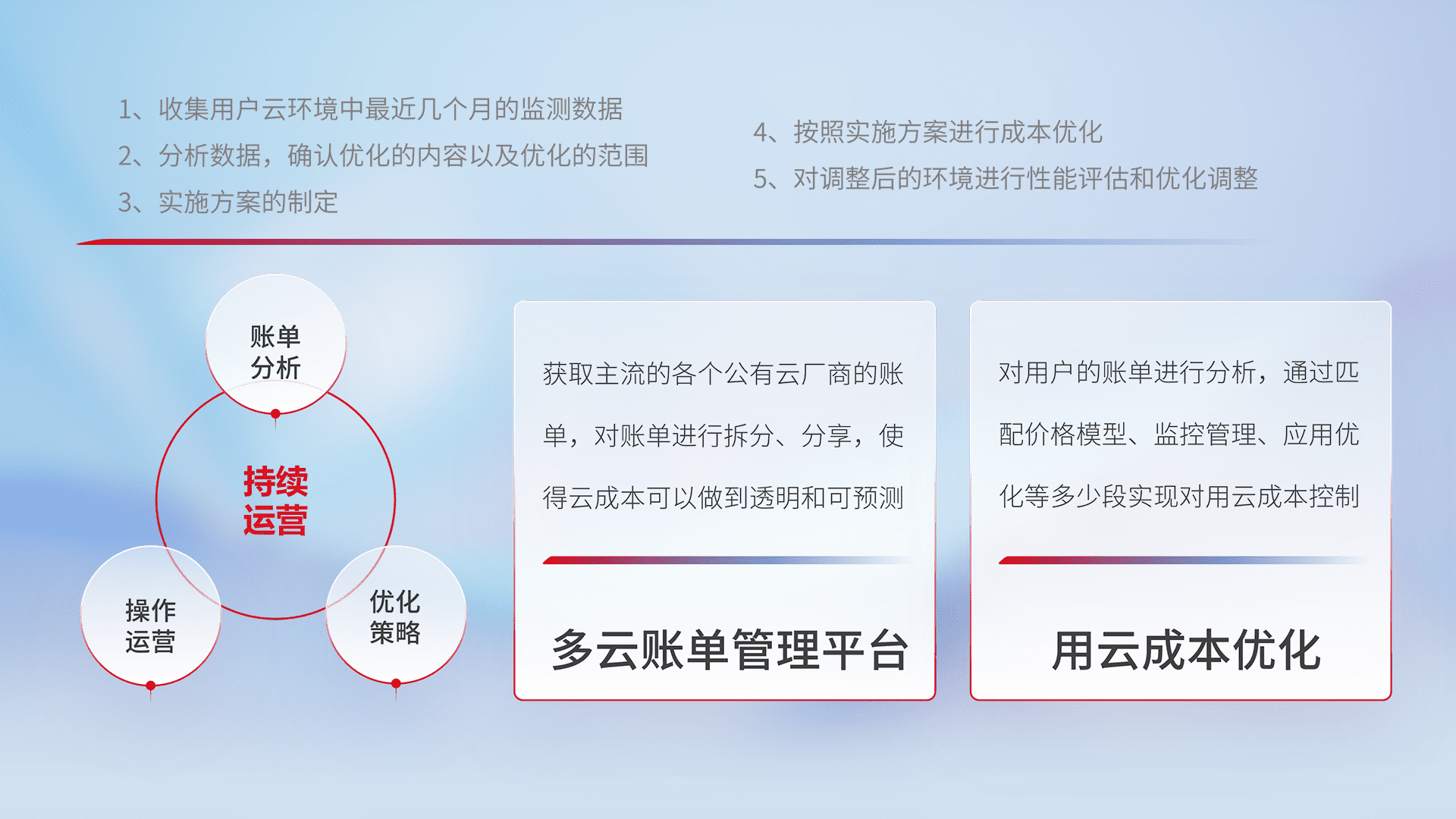 通过多云纳管,,,以统一的资源数据模型把客户的云资源进行抽象和封装,,进而实现对多云资源的统一操作,,,保障云资源管理的可靠性、、稳定性与可用性。。。。量身定制化运维内容,,,配置、、开发运维、、补丁管理、、、、备份、、、监控、、、认证和访问管理、、审计和日常巡检等,,,保障在用云过程中的可靠度,,,,稳定度以及高可用率。。